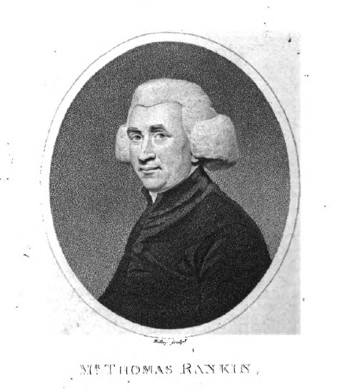 Thomas Rankin, methodist divine, and friend of John Wesley, was born in Dunbar, East Lothian, in 1735. His early home training gave his mind a religious bent, but, on the death of his father in 1753, he grew dissipated. Shortly afterwards a troop of dragoons, some of whom had come under the influence of methodist preachers, came to Dunbar, and held religious meetings in the morning and evening. The strangeness of the proceeding brought crowds to the services, and Rankin was greatly influenced by them. Removing to Leith, he heard Whitefield preach his farewell sermon at Orphan-house Yard, Edinburgh, and finally decided to become a preacher. Circumstances delayed the fulfilment of his design. After spending a few months in Charlestown, South Carolina, as agent for a firm of Edinburgh merchants, he was induced by a Wesleyan itinerant preacher in 1759 to visit some methodist societies in the north of England, and during this tour Rankin preached his first sermons. For two years he endured much mental trouble and uncertainty, and at Morpeth, in 1761, sought the counsel of Wesley. After another interview with Wesley in London, Rankin's doubts were removed, and in that year he was appointed to the Sussex circuit. For twelve years he moved through the country, at times accompanying Wesley himself (1769–70). Between the two a close friendship arose, Wesley in his letters always addressing Rankin as ‘My dear Tommy.’